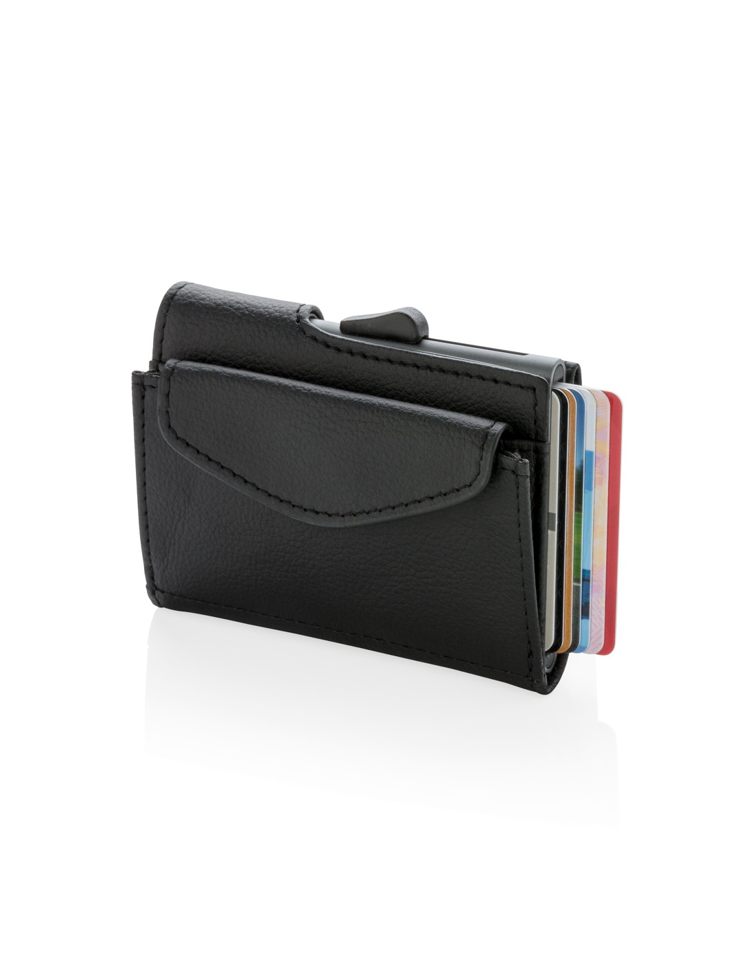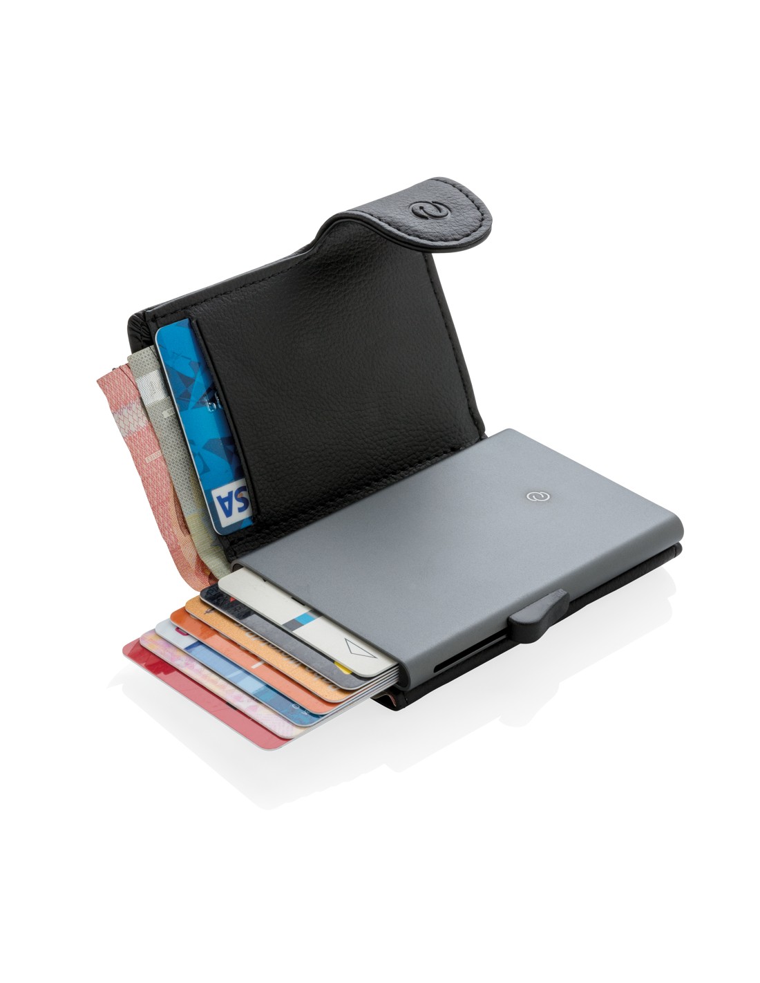 Denne solide aluminiums kortholder med pung beskytter dine vigtigste kort mod elektronisk lommetyveri. Slut med ødelagte eller knækkede kort. Kan rumme op til 7 glatte kort eller 5 prægede kort. Den smart skydeknap i siden skubber kortene op gradvist. Pungen har plads til dine kontanter. Det ekstra møntrum i siden kan også rumme dine mønter og nøgler.