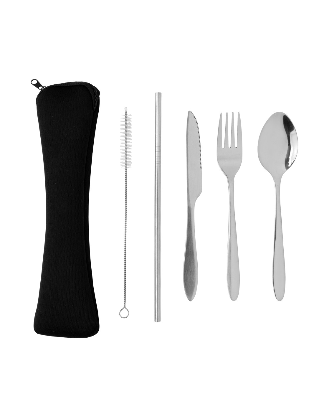 Genanvendeligt bestiksæt i rustfrit stål, som du nemt kan tage med dig overalt, perfekt til når du tager din frokost med på arbejde. Dette sæt indeholder en gaffel, kniv, ske, sugerør og børste, så du kan rense sugerøret. Alle artikler passer i neoprenposen, der har lynlås og lukkesnor.