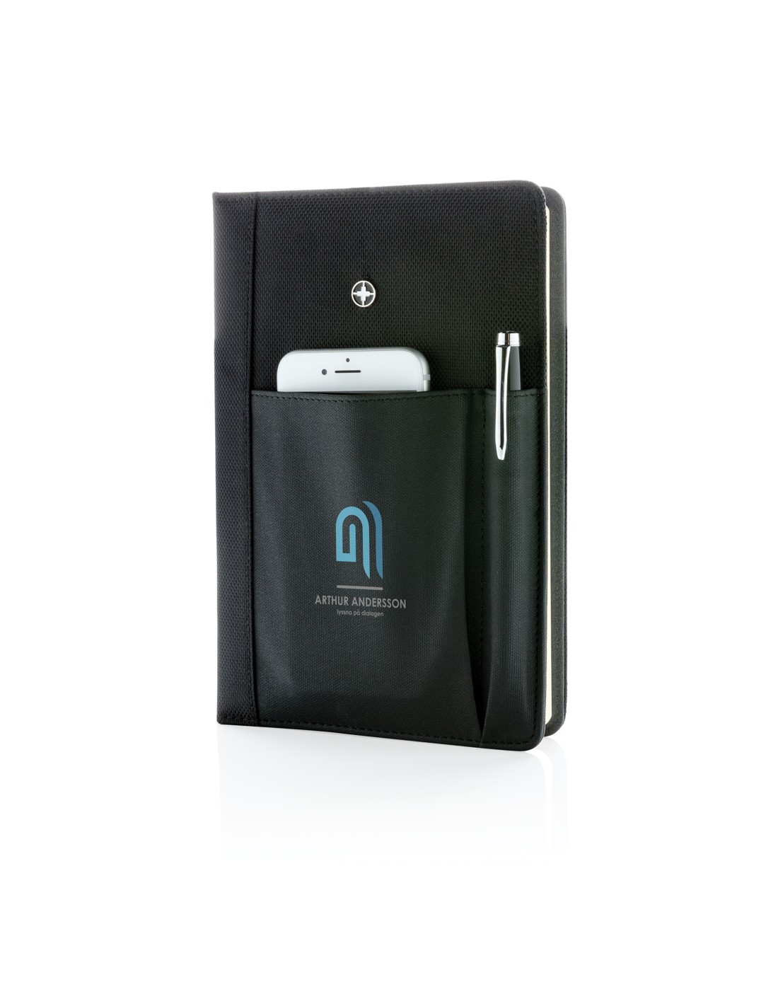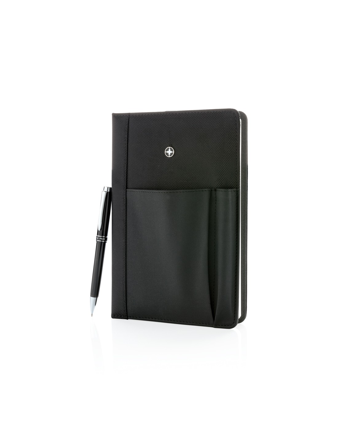 Eksklusiv 1.680D og 600D polyester notesbog omslag med pen. Inklusive aftagelig notesblok med 192 siders 80gr/m2 papir. Lommen på omslaget har plads til penne, kreditkort, kontanter, mobiltelefon etc. Pakket i flot Swiss Peak gaveæske